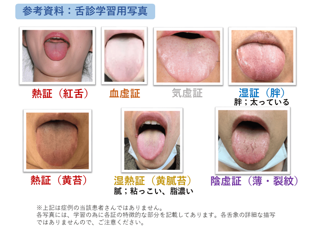 各写真には、学習の為に各証の特徴的な部分を記載してあります。各舌象の詳細な描写ではありませんので、ご注意ください。 膩;粘っこい、脂濃い 陰虚証(薄・裂紋) 胖;太っている 参考資料:舌診学習用写真