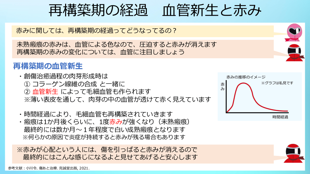 #10. 再構築期の経過 血管新生と赤み 赤みに関しては、再構築期の経過ってどうなってるの? 未熟瘢痕の赤みは、血管による色なので、圧迫すると赤みが消えます 再構築期の赤みの変化については、血管に注目しましょう 再構築期の血管新生 ・創傷治癒過程の肉芽形成時は ① コラーゲン線維の合成 と一緒に ② 血管新生 によって毛細血管も作られます ※薄い表皮を通して、肉芽の中の血管が透けて赤く見えています ・時間経過により、毛細血管も再構築されていきます ・瘢痕は1か月後くらいに、1度赤みが強くなり(未熟瘢痕) 最終的には数か月~1年程度で白い成熟瘢痕となります ※何らかの原因で炎症が持続すると赤みが残る場合もあります ※赤みが心配という人には、傷を引っぱると赤みが消えるので 最終的にはこんな感じになるよと見せてあげると安心します 参考文献:小川令. 傷あと治療. 克誠堂出版, 2021. 赤みの推移のイメージ 赤 み ※グラフは私見です 時間経過