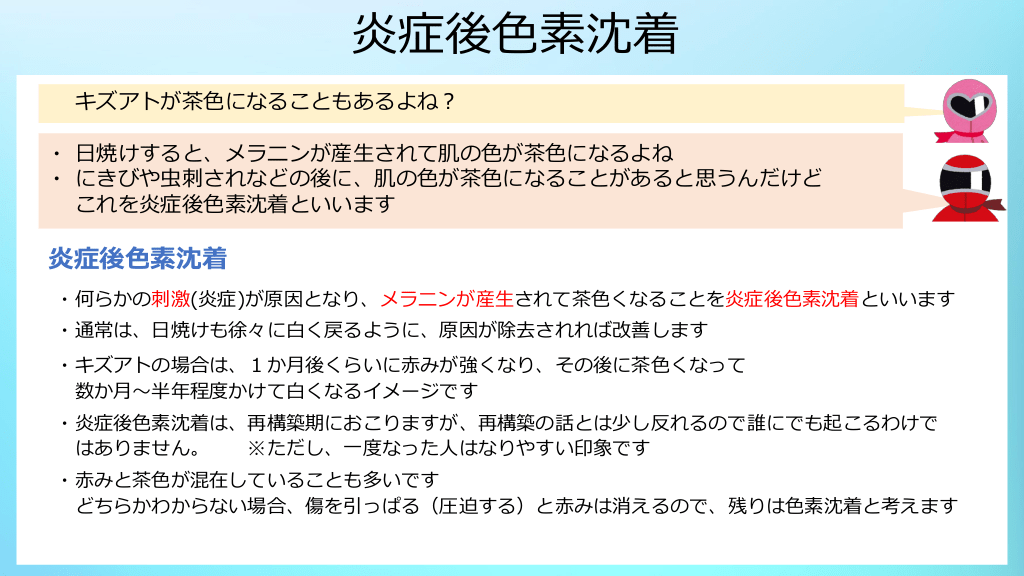 #11. 炎症後色素沈着 キズアトが茶色になることもあるよね? ・ 日焼けすると、メラニンが産生されて肌の色が茶色になるよね ・ にきびや虫刺されなどの後に、肌の色が茶色になることがあると思うんだけど これを炎症後色素沈着といいます 炎症後色素沈着 ・何らかの刺激(炎症)が原因となり、メラニンが産生されて茶色くなることを炎症後色素沈着といいます ・通常は、日焼けも徐々に白く戻るように、原因が除去されれば改善します ・キズアトの場合は、1か月後くらいに赤みが強くなり、その後に茶色くなって 数か月~半年程度かけて白くなるイメージです ・炎症後色素沈着は、再構築期におこりますが、再構築の話とは少し反れるので誰にでも起こるわけで はありません。 ※ただし、一度なった人はなりやすい印象です ・赤みと茶色が混在していることも多いです どちらかわからない場合、傷を引っぱる(圧迫する)と赤みは消えるので、残りは色素沈着と考えます