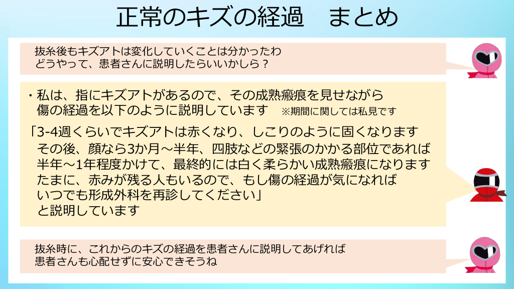 #12. 正常のキズの経過 まとめ 抜糸後もキズアトは変化していくことは分かったわ どうやって、患者さんに説明したらいいかしら? ・私は、指にキズアトがあるので、その成熟瘢痕を見せながら 傷の経過を以下のように説明しています ※期間に関しては私見です 「3-4週くらいでキズアトは赤くなり、しこりのように固くなります その後、顔なら3か月~半年、四肢などの緊張のかかる部位であれば 半年~1年程度かけて、最終的には白く柔らかい成熟瘢痕になります たまに、赤みが残る人もいるので、もし傷の経過が気になれば いつでも形成外科を再診してください」 と説明しています 抜糸時に、これからのキズの経過を患者さんに説明してあげれば 患者さんも心配せずに安心できそうね