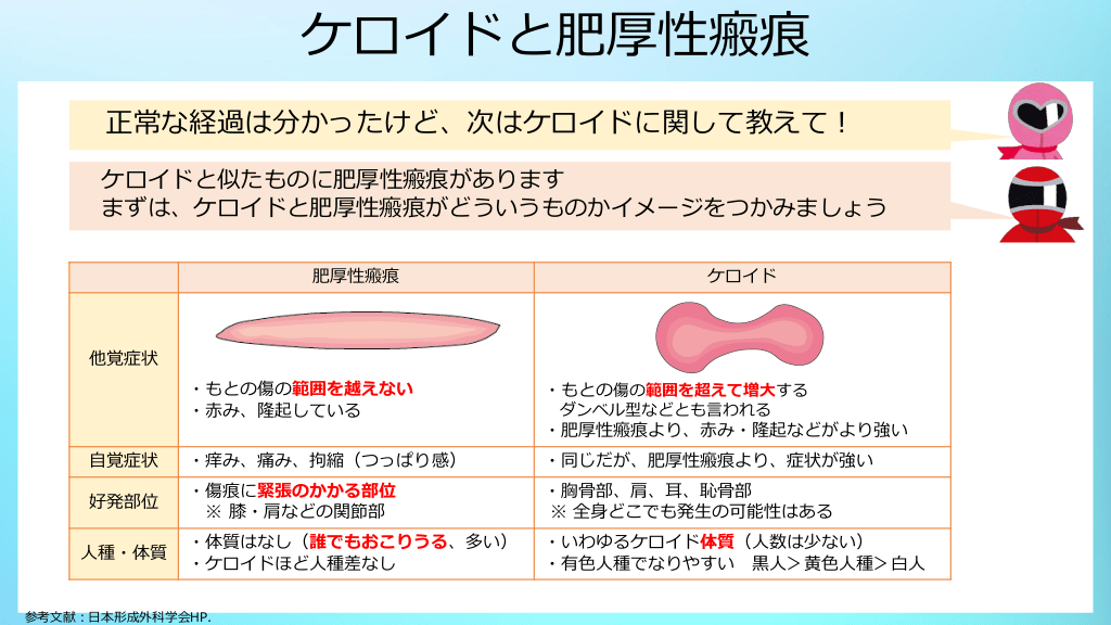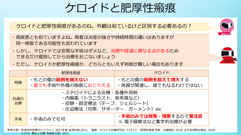 #14. ケロイドと肥厚性瘢痕 ケロイドと肥厚性瘢痕があるのね。外観は似ているけど区別する必要あるの? ・両疾患とも似ていますよね。両者は炎症の強さや持続時間の違いはありますが 同一病態である可能性も言われています ・しかし、ケロイドでは安易な手術はダメなど、治療や経過に異なる点があるため できるだけ鑑別してから治療をおこないましょう ・ただし、ケロイドか肥厚性瘢痕か、どちらともいえず判断が難しい場合もあります 肥厚性瘢痕 特徴 共通の 治療 手術 ・もとの傷の範囲を越えない ・誰でも手術や外傷の瘢痕におこりえる ケロイド ・もとの傷の範囲を超えて増大する ・体質が関連し、誰でもなるわけではない ・ステロイドによる治療・各種外用剤 ・内服薬(トラニラスト、柴苓湯など) ・安静・固定療法(テープ、ジェルシート) ・圧迫療法(包帯、サポーター、ガーメント)etc ・手術のみでも可 ・手術のみでは再発・増悪するので要注意 ※ 電子線療法など集学的治療が必要 参考文献:形成外科診療ガイドライン 2021年版.金原出版,2021. 瘢痕・ケロイド治療研究会. ケロイド・肥厚性瘢痕 診断・治療指針 2018. 全日本病院出版会, 2018. 小川令. 傷あと治療.克誠堂出版, 2021.
