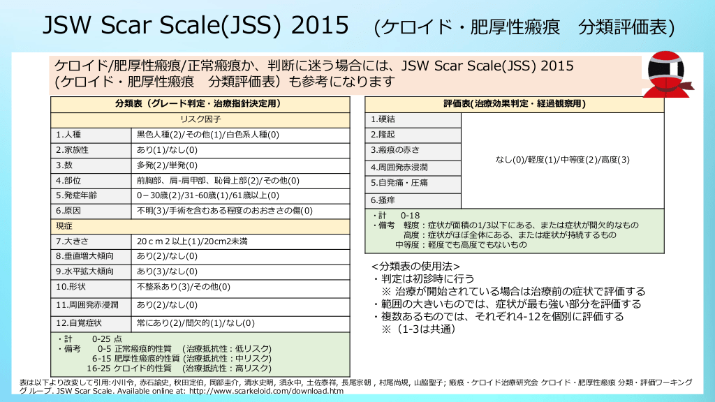 #15. JSW Scar Scale(JSS) 2015 (ケロイド・肥厚性瘢痕 分類評価表) ケロイド/肥厚性瘢痕/正常瘢痕か、判断に迷う場合には、JSW Scar Scale(JSS) 2015 (ケロイド・肥厚性瘢痕 分類評価表)も参考になります 評価表(治療効果判定・経過観察用) 分類表(グレード判定・治療指針決定用) リスク因子 1.硬結 1.人種 黒色人種(2)/その他(1)/白色系人種(0) 2.隆起 2.家族性 あり(1)/なし(0) 3.瘢痕の赤さ 3.数 多発(2)/単発(0) 4.周囲発赤浸潤 4.部位 前胸部、肩-肩甲部、恥骨上部(2)/その他(0) 5.自発痛・圧痛 5.発症年齢 0-30歳(2)/31-60歳(1)/61歳以上(0) 6.原因 不明(3)/手術を含むある程度のおおきさの傷(0) 現症 7.大きさ 20cm2以上(1)/20cm2未満 8.垂直増大傾向 あり(2)/なし(0) 9.水平拡大傾向 あり(3)/なし(0) 10.形状 不整系あり(3)/その他(0) 11.周囲発赤浸潤 あり(2)/なし(0) 12.自覚症状 常にあり(2)/間欠的(1)/なし(0) ・計 ・備考 0-25 点 0-5 正常瘢痕的性質 (治療抵抗性:低リスク) 6-15 肥厚性瘢痕的性質 (治療抵抗性:中リスク) 16-25 ケロイド的性質 (治療抵抗性:高リスク) なし(0)/軽度(1)/中等度(2)/高度(3) 6.掻痒 ・計 0-18 ・備考 軽度:症状が面積の1/3以下にある、または症状が間欠的なもの 高度:症状がほぼ全体にある、または症状が持続するもの 中等度:軽度でも高度でもないもの <分類表の使用法> ・判定は初診時に行う ※ 治療が開始されている場合は治療前の症状で評価する ・範囲の大きいものでは、症状が最も強い部分を評価する ・複数あるものでは、それぞれ4-12を個別に評価する ※(1-3は共通) 表は以下より改変して引用:小川令, 赤石諭史, 秋田定伯, 岡部圭介, 清水史明, 須永中, 土佐泰祥, 長尾宗朝 , 村尾尚規, 山脇聖子; 瘢痕・ケロイド治療研究会 ケロイド・肥厚性瘢痕 分類・評価ワーキング グ ループ. JSW Scar Scale. Avail