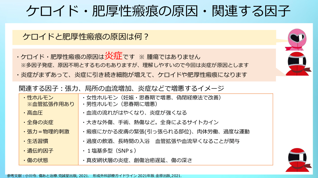 #16. ケロイド・肥厚性瘢痕の原因・関連する因子 ケロイドと肥厚性瘢痕の原因は何? ・ケロイド・肥厚性瘢痕の原因は炎症です ※ 腫瘍ではありません ※多因子発症、原因不明とするものもありますが、理解しやすいので今回は炎症が原因とします ・炎症がまずあって、炎症に引き続き細胞が増えて、ケロイドや肥厚性瘢痕になります 関連する因子:張力、局所の血流増加、炎症などで増悪するイメージ ・性ホルモン ※血管拡張作用あり ・女性ホルモン(妊娠・思春期で増悪、偽閉経療法で改善) ・男性ホルモン(思春期に増悪) ・高血圧 ・血流の流れがはやくなり、炎症が強くなる ・全身の炎症 ・大きな外傷、手術、熱傷など。全身によるサイトカイン ・張力=物理的刺激 ・瘢痕にかかる皮膚の緊張(引っ張られる部位)、肉体労働、過度な運動 ・生活習慣 ・過度の飲酒、長時間の入浴 ・遺伝的因子 ・1塩基多型(SNPs) ・傷の状態 ・真皮網状層の炎症、創傷治癒遅延、傷の深さ 参考文献:小川令. 傷あと治療.克誠堂出版, 2021. 血管拡張や血流早くなることが関与 形成外科診療ガイドライン 2021年版.金原出版,2021.
