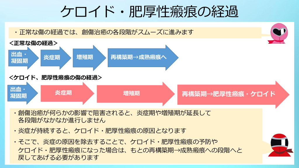#17. ケロイド・肥厚性瘢痕の経過 ・正常な傷の経過では、創傷治癒の各段階がスムーズに進みます <正常な傷の経過> 出血・ 凝固期 炎症期 増殖期 再構築期→成熟瘢痕へ <ケロイド、肥厚性瘢痕の傷の経過> 出血・ 凝固期 炎症期 増殖期 再構築期→肥厚性瘢痕・ケロイド ・創傷治癒が何らかの影響で阻害されると、炎症期や増殖期が延長して 各段階がなかなか進行しません ・炎症が持続すると、ケロイド・肥厚性瘢痕の原因となります ・そこで、炎症の原因を除去することで、ケロイド・肥厚性瘢痕の予防や ケロイド・肥厚性瘢痕になった場合は、もとの再構築期→成熟瘢痕への段階へと 戻してあげる必要があります