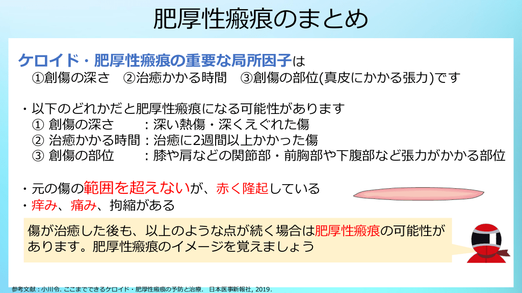 #19. 肥厚性瘢痕のまとめ ケロイド・肥厚性瘢痕の重要な局所因子は ①創傷の深さ ②治癒かかる時間 ③創傷の部位(真皮にかかる張力)です ・以下のどれかだと肥厚性瘢痕になる可能性があります ① 創傷の深さ :深い熱傷・深くえぐれた傷 ② 治癒かかる時間:治癒に2週間以上かかった傷 ③ 創傷の部位 :膝や肩などの関節部・前胸部や下腹部など張力がかかる部位 ・元の傷の範囲を超えないが、赤く隆起している ・痒み、痛み、拘縮がある 傷が治癒した後も、以上のような点が続く場合は肥厚性瘢痕の可能性が あります。肥厚性瘢痕のイメージを覚えましょう 参考文献:小川令. ここまでできるケロイド・肥厚性瘢痕の予防と治療. 日本医事新報社, 2019.
