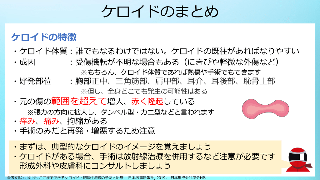#20. ケロイドのまとめ ケロイドの特徴 ・ケロイド体質:誰でもなるわけではない。ケロイドの既往があればなりやすい ・成因 :受傷機転が不明な場合もある(にきびや軽微な外傷など) ※もちろん、ケロイド体質であれば熱傷や手術でもできます ・好発部位 :胸部正中、三角筋部、肩甲部、耳介、耳後部、恥骨上部 ※但し、全身どこでも発生の可能性はある ・元の傷の範囲を超えて増大、赤く隆起している ※張力の方向に拡大し、ダンベル型・カニ型などと言われます ・痒み、痛み、拘縮がある ・手術のみだと再発・増悪するため注意 ・まずは、典型的なケロイドのイメージを覚えましょう ・ケロイドがある場合、手術は放射線治療を併用するなど注意が必要です 形成外科や皮膚科にコンサルトしましょう 参考文献:小川令. ここまでできるケロイド・肥厚性瘢痕の予防と治療. 日本医事新報社, 2019. 日本形成外科学会HP.