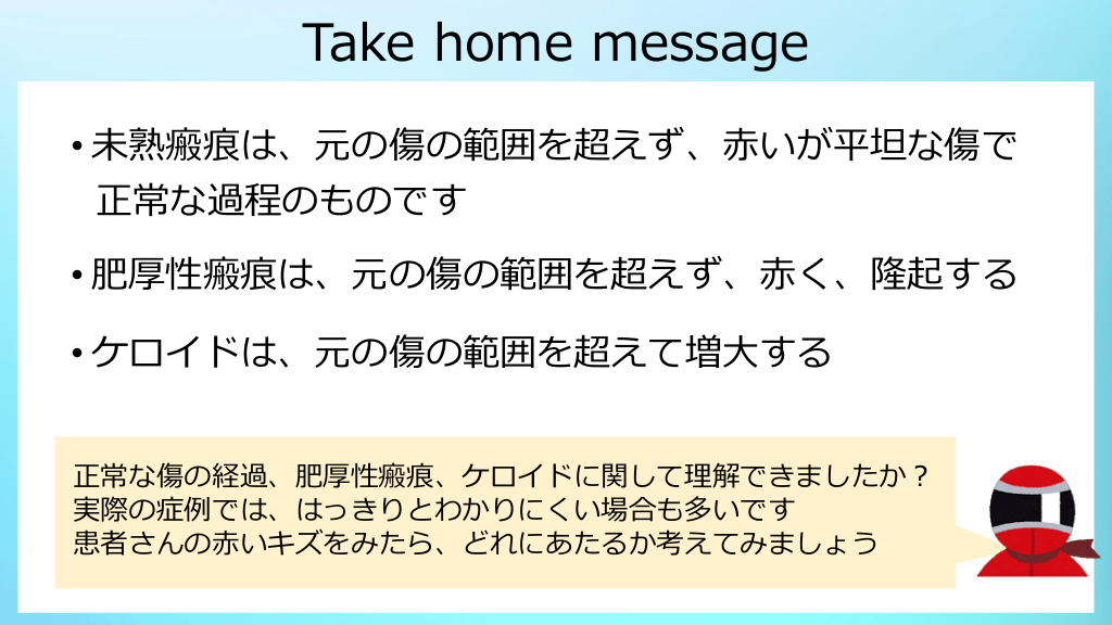 #22. Take home message • 未熟瘢痕は、元の傷の範囲を超えず、赤いが平坦な傷で 正常な過程のものです • 肥厚性瘢痕は、元の傷の範囲を超えず、赤く、隆起する • ケロイドは、元の傷の範囲を超えて増大する 正常な傷の経過、肥厚性瘢痕、ケロイドに関して理解できましたか? 実際の症例では、はっきりとわかりにくい場合も多いです 患者さんの赤いキズをみたら、どれにあたるか考えてみましょう