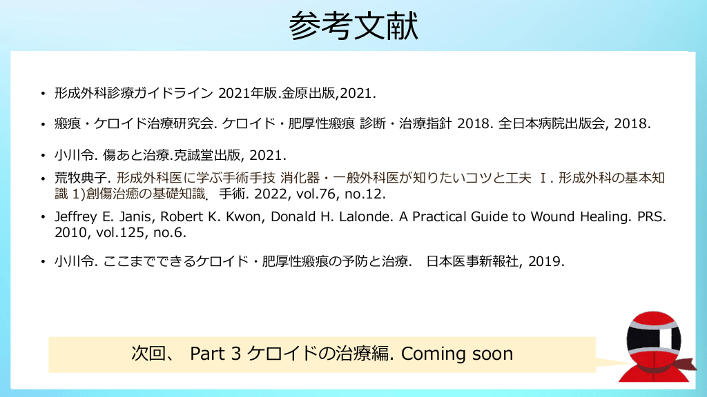 #23. 参考文献 ・形成外科診療ガイドライン 2021年版. • 形成外科診療ガイドライン 2021年版.金原出版,2021. ・田嶋定夫. 形成外科手術手技シリーズ 顔面骨骨折の治療. • 瘢痕・ケロイド治療研究会. ケロイド・肥厚性瘢痕 診断・治療指針 2018. 全日本病院出版会, 2018. 改訂第2版. 克誠堂出版, 1999. • 小川令. 傷あと治療.克誠堂出版, 2021. ・平野明喜. 形成外科診療プラクティス 顔面骨骨折の治療の実際. 消化器・一般外科医が知りたいコツと工夫 Ⅰ. 形成外科の基本知 • 荒牧典子. 形成外科医に学ぶ手術手技 識 1)創傷治癒の基礎知識 .手術. 2022, vol.76, no.12. 文光堂, 2010. • Jeffrey E. Janis, Robert K. Kwon, Donald H. Lalonde. A Practical Guide to Wound Healing. PRS. ・医学大辞典 第2版. 医学書院, 2009. 2010, vol.125, no.6. • 小川令. ここまでできるケロイド・肥厚性瘢痕の予防と治療. 日本医事新報社, 2019. 次回、 Part 3 ケロイドの治療編. Coming soon