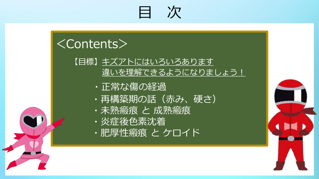 #3. 目 次 <Contents> 【目標】キズアトにはいろいろあります 違いを理解できるようになりましょう! ・正常な傷の経過 ・再構築期の話(赤み、硬さ) ・未熟瘢痕 と 成熟瘢痕 ・炎症後色素沈着 ・肥厚性瘢痕 と ケロイド
