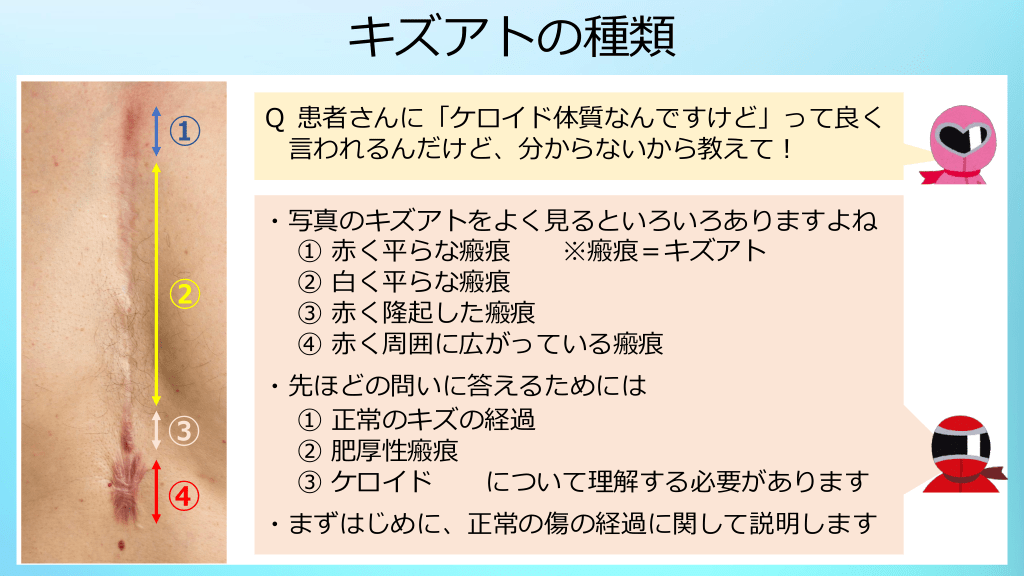 #4. キズアトの種類 ① Q 患者さんに「ケロイド体質なんですけど」って良く 言われるんだけど、分からないから教えて! ② ・写真のキズアトをよく見るといろいろありますよね ① 赤く平らな瘢痕 ※瘢痕=キズアト ② 白く平らな瘢痕 ③ 赤く隆起した瘢痕 ④ 赤く周囲に広がっている瘢痕 ③ ・先ほどの問いに答えるためには ① 正常のキズの経過 ② 肥厚性瘢痕 ③ ケロイド について理解する必要があります ④ ・まずはじめに、正常の傷の経過に関して説明します