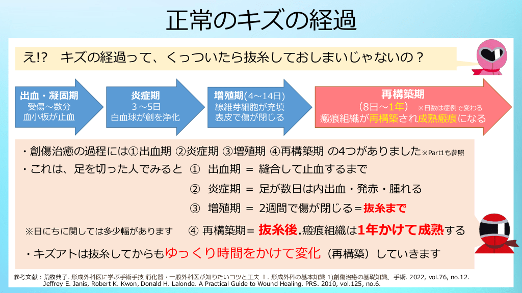 #5. 正常のキズの経過 え!? キズの経過って、くっついたら抜糸しておしまいじゃないの? 出血・凝固期 炎症期 増殖期(4~14日) 受傷~数分 血小板が止血 3~5日 白血球が創を浄化 線維芽細胞が充填 表皮で傷が閉じる 再構築期 (8日~1年) ※日数は症例で変わる 瘢痕組織が再構築され成熟瘢痕になる ・創傷治癒の過程には①出血期 ②炎症期 ③増殖期 ④再構築期 の4つがありました※Part1も参照 ・これは、足を切った人でみると ① 出血期 = 縫合して止血するまで ② 炎症期 = 足が数日は内出血・発赤・腫れる ③ 増殖期 = 2週間で傷が閉じる=抜糸まで ※日にちに関しては多少幅があります ④ 再構築期= 抜糸後.瘢痕組織は1年かけて成熟する ・キズアトは抜糸してからもゆっくり時間をかけて変化(再構築)していきます 参考文献:荒牧典子. 形成外科医に学ぶ手術手技 消化器・一般外科医が知りたいコツと工夫 Ⅰ. 形成外科の基本知識 1)創傷治癒の基礎知識.手術. 2022, vol.76, no.12. Jeffrey E. Janis, Robert K. Kwon, Donald H. Lalonde. A Practical Guide to Wound Healing. PRS. 2010, vol.125, no.6.