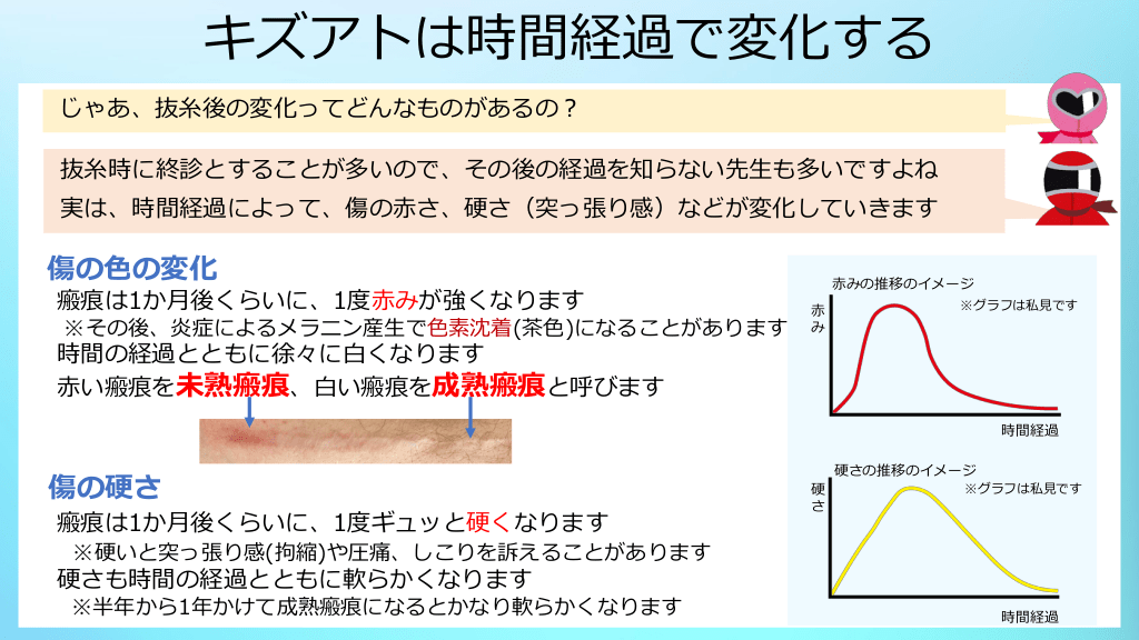 #6. キズアトは時間経過で変化する じゃあ、抜糸後の変化ってどんなものがあるの? 抜糸時に終診とすることが多いので、その後の経過を知らない先生も多いですよね 実は、時間経過によって、傷の赤さ、硬さ(突っ張り感)などが変化していきます 傷の色の変化 瘢痕は1か月後くらいに、1度赤みが強くなります ※その後、炎症によるメラニン産生で色素沈着(茶色)になることがあります 赤みの推移のイメージ 赤 み ※グラフは私見です 時間の経過とともに徐々に白くなります 赤い瘢痕を未熟瘢痕、白い瘢痕を成熟瘢痕と呼びます 時間経過 傷の硬さ 瘢痕は1か月後くらいに、1度ギュッと硬くなります 硬さの推移のイメージ 硬 さ ※グラフは私見です ※硬いと突っ張り感(拘縮)や圧痛、しこりを訴えることがあります 硬さも時間の経過とともに軟らかくなります ※半年から1年かけて成熟瘢痕になるとかなり軟らかくなります 時間経過