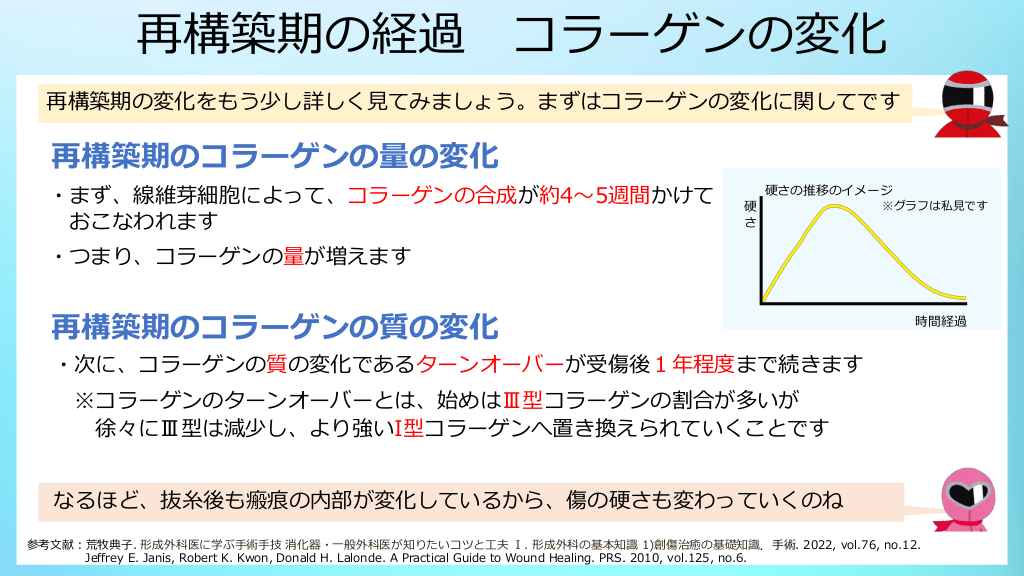 #7. 再構築期の経過 コラーゲンの変化 再構築期の変化をもう少し詳しく見てみましょう。まずはコラーゲンの変化に関してです 再構築期のコラーゲンの量の変化 ・まず、線維芽細胞によって、コラーゲンの合成が約4~5週間かけて おこなわれます 硬さの推移のイメージ 硬 さ ※グラフは私見です ・つまり、コラーゲンの量が増えます 再構築期のコラーゲンの質の変化 時間経過 ・次に、コラーゲンの質の変化であるターンオーバーが受傷後1年程度まで続きます ※コラーゲンのターンオーバーとは、始めはⅢ型コラーゲンの割合が多いが 徐々にⅢ型は減少し、より強いI型コラーゲンへ置き換えられていくことです なるほど、抜糸後も瘢痕の内部が変化しているから、傷の硬さも変わっていくのね 参考文献:荒牧典子. 形成外科医に学ぶ手術手技 消化器・一般外科医が知りたいコツと工夫 Ⅰ. 形成外科の基本知識 1)創傷治癒の基礎知識.手術. 2022, vol.76, no.12. Jeffrey E. Janis, Robert K. Kwon, Donald H. Lalonde. A Practical Guide to Wound Healing. PRS. 2010, vol.125, no.6.