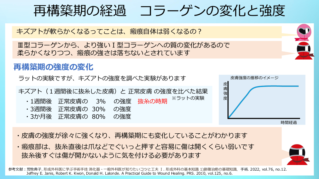 #8. 再構築期の経過 コラーゲンの変化と強度 キズアトが軟らかくなるってことは、瘢痕自体は弱くなるの? Ⅲ型コラーゲンから、より強いⅠ型コラーゲンへの質の変化があるので 柔らかくなりつつ、瘢痕の強さは落ちないとされています 再構築期の強度の変化 ラットの実験ですが、キズアトの強度を調べた実験があります キズアト(1週間後に抜糸した皮膚)と 正常皮膚 の強度を比べた結果 ・1週間後 正常皮膚の 3% ・3週間後 正常皮膚の 30% ・3か月後 正常皮膚の 80% の強度 の強度 の強度 抜糸の時期 ※ラットの実験 皮膚強度の推移のイメージ 皮 膚 強 度 時間経過 ・皮膚の強度が徐々に強くなり、再構築期にも変化していることがわかります ・瘢痕部は、抜糸直後は爪などでぐいっと押すと容易に傷は開くくらい弱いです 抜糸後すぐは傷が開かないように気を付ける必要があります 参考文献:荒牧典子. 形成外科医に学ぶ手術手技 消化器・一般外科医が知りたいコツと工夫 Ⅰ. 形成外科の基本知識 1)創傷治癒の基礎知識.手術. 2022, vol.76, no.12. Jeffrey E. Janis, Robert K. Kwon, Donald H. Lalonde. A Practical Guide to Wound Healing. PRS. 2010, vol.125, no.6.
