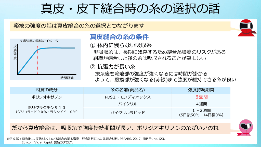 #9. 真皮・皮下縫合時の糸の選択の話 瘢痕の強度の話は真皮縫合の糸の選択とつながります 真皮縫合の糸の条件 皮膚強度の推移のイメージ 皮 膚 強 度 真皮縫合の糸の条件 ① 体内に残らない吸収糸 非吸収糸は、長期に残存するため縫合糸膿瘍のリスクがある 組織が癒合した後の糸は吸収されることが望ましい ② 抗張力が長い糸 時間経過 抜糸後も瘢痕部の強度が強くなるには時間が掛かる よって、瘢痕部が強くなる(赤線)まで強度が維持できる糸が良い 材質の成分 糸の名前(商品名) 強度持続期間 ポリジオキサノン PDSⅡ・モノディオックス 6週間 バイクリル 4週間 バイクリルラピッド 1~2週間 (5日後50% 14日後0%) ポリグラクチン910 (グリコライド90%・ラクタイド10%) だから真皮縫合は、吸収糸で強度持続期間が長い、ポリジオキサノンの糸がいいのね 参考文献:菊池雄二. 実践!よくわかる縫合の基本講座 形成外科における縫合材料. PEPARS. 2017, 増刊号, no.123. Ethicon. Vicryl Rapid. 製品カタログ.