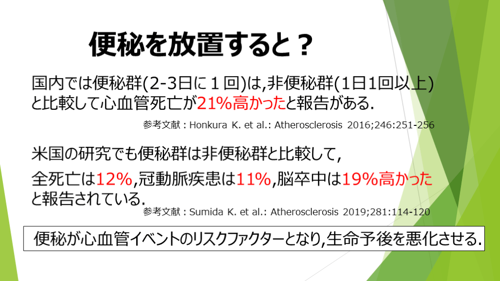 全死亡は12%,冠動脈疾患は11%,脳卒中は19%高かったと報告されている. 便秘が心血管イベントのリスクファクターとなり,生命予後を悪化させる. 参考文献:Honkura K. et al.: Atherosclerosis 2016;246:251-256 参考文献:Sumida K. et al.: Atherosclerosis 2019;281:114-120