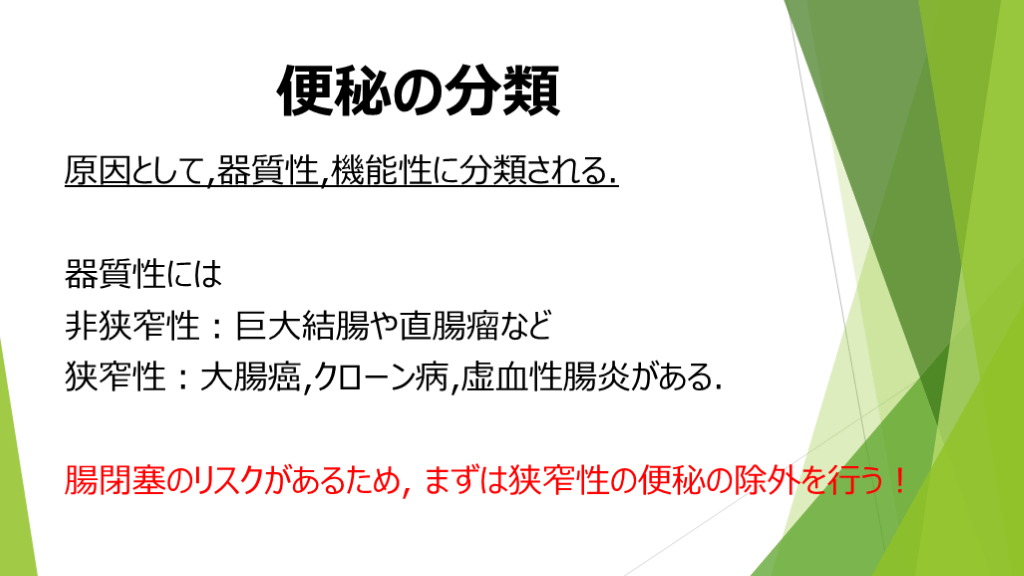 腸閉塞のリスクがあるため, まずは狭窄性の便秘の除外を行う!