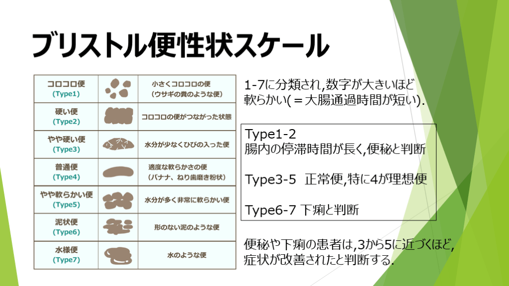・ブリストル便性状スケールなどで評価する.