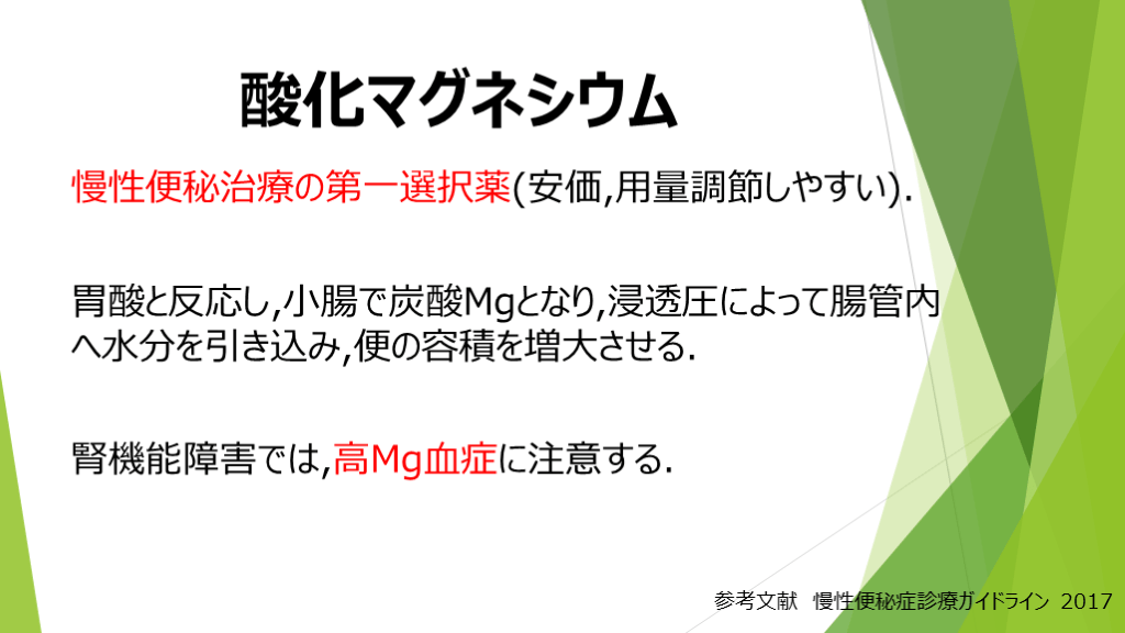 #13. 酸化マグネシウム 慢性便秘治療の第一選択薬(安価,用量調節しやすい).