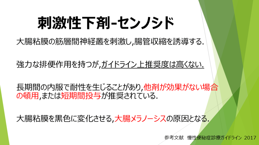 強力な排便作用を持つが,ガイドライン上推奨度は高くない.