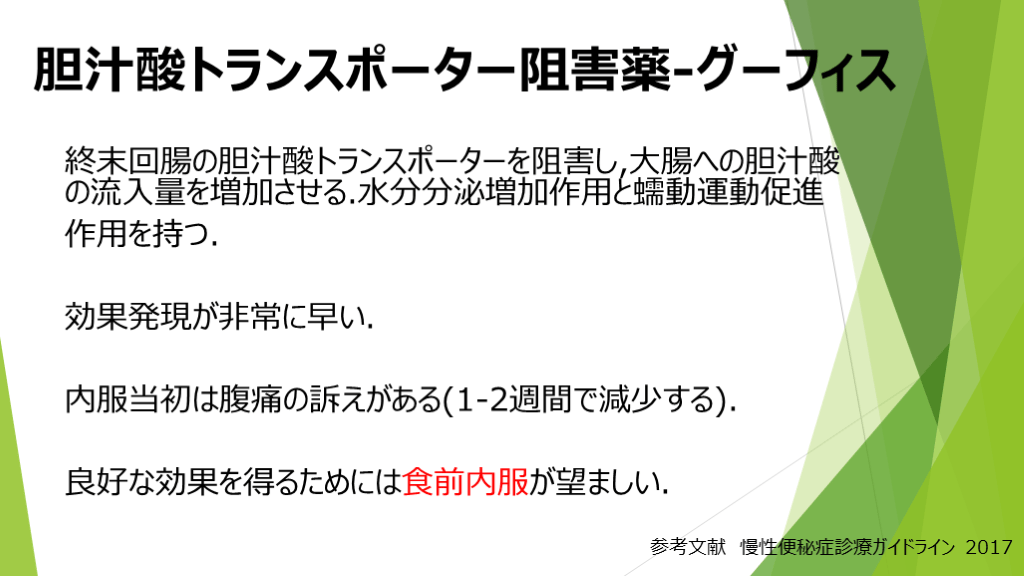 #20. 胆汁酸トランスポーター阻害薬-グーフィス 終末回腸の胆汁酸トランスポーターを阻害し,大腸への胆汁酸の流入量を増加させる.水分分泌増加作用と蠕動運動促進