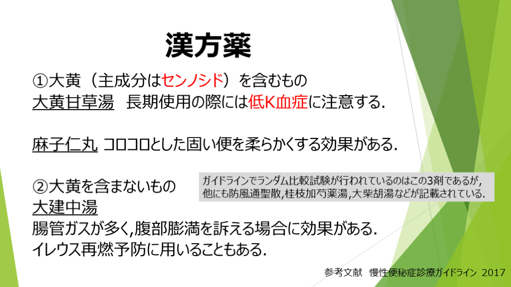 他にも防風通聖散,桂枝加芍薬湯,大柴胡湯などが記載されている. 参考文献 慢性便秘症診療ガイドライン 2017