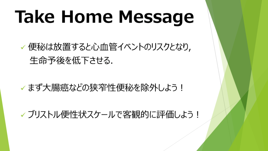#23. Take Home Message 便秘は放置すると心血管イベントのリスクとなり,