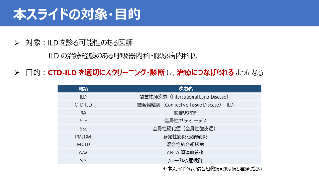 本スライドの対象・目的 対象:ILD を診る可能性のある医師 ILD の治療経験のある呼吸器内科・膠原病内科医 目的:CTD-ILD を適切にスクリーニング・診断 し、治療につなげられる ようになる ※本スライドでは、結合組織病=膠原病と理解ください