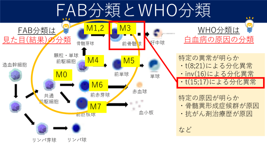 で、AMLはリンパ球が分かれたあとの未熟細胞が原因となります。