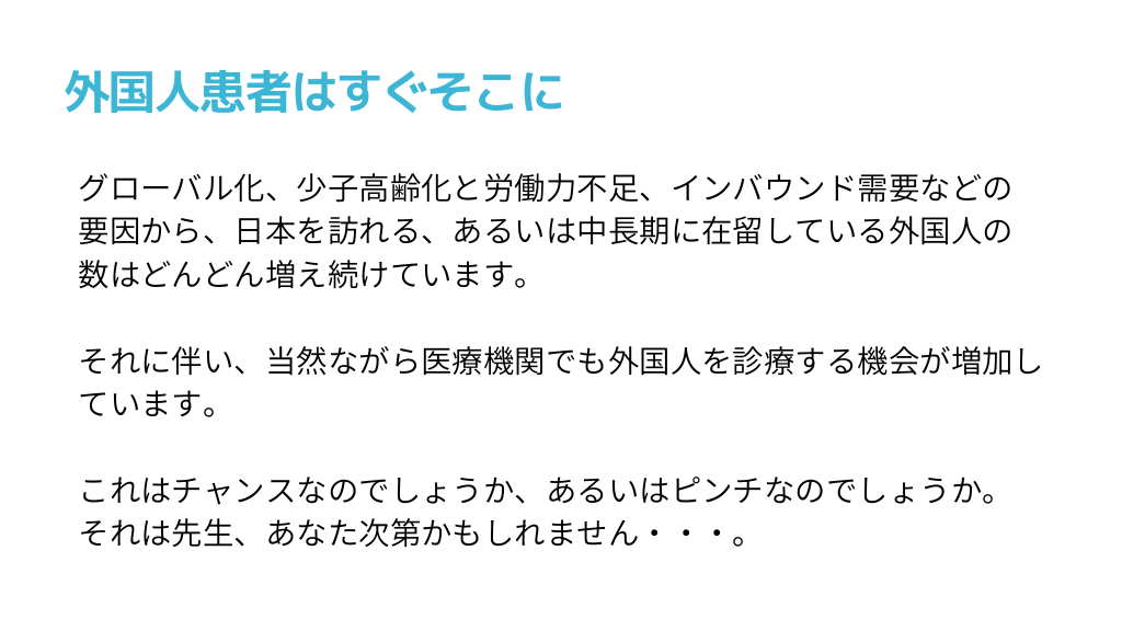 このスライドでは、外国人患者の診療における医師の考え方や注意すべきポイントを詳しく解説します。