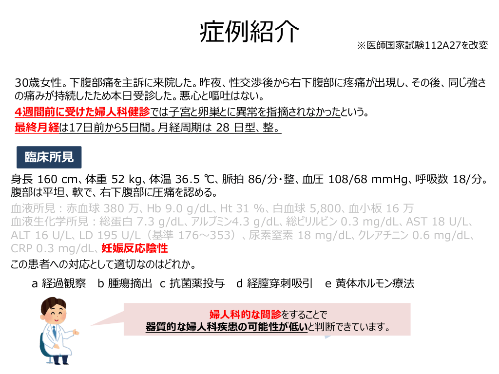 #10. 症例紹介 ※医師国家試験112A27を改変 30歳⼥性。下腹部痛を主訴に来院した。昨夜、性交渉後から右下腹部に疼痛が出現し、その後、同じ強さ の痛みが持続したため本⽇受診した。悪⼼と嘔吐はない。 4週間前に受けた婦⼈科健診では⼦宮と卵巣とに異常を指摘されなかったという。 最終⽉経は17⽇前から5⽇間。⽉経周期は 28 ⽇型、整。 臨床所⾒ ⾝⻑ 160 cm、体重 52 kg、体温 36.5 ℃、脈拍 86/分・整、⾎圧 108/68 mmHg、呼吸数 18/分。 腹部は平坦、軟で、右下腹部に圧痛を認める。 ⾎液所⾒︓⾚⾎球 380 万、Hb 9.0 g/dL、Ht 31 %、⽩⾎球 5,800、⾎⼩板 16 万 ⾎液⽣化学所⾒︓総蛋⽩ 7.3 g/dL、アルブミン4.3 g/dL、総ビリルビン 0.3 mg/dL、AST 18 U/L、 ALT 16 U/L、LD 195 U/L(基準 176〜353)、尿素窒素 18 mg/dL、クレアチニン 0.6 mg/dL、 CRP 0.3 mg/dL、妊娠反応陰性 この患者への対応として適切なのはどれか。 a 経過観察 b 腫瘍摘出 c 抗菌薬投与 d 経膣穿刺吸引 e ⻩体ホルモン療法 婦⼈科的な問診をすることで 器質的な婦⼈科疾患の可能性が低いと判断できています。
