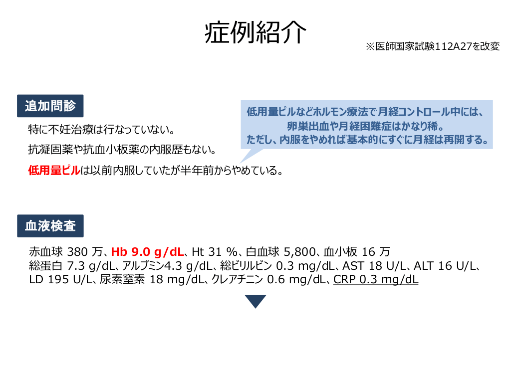 #11. 症例紹介 追加問診 特に不妊治療は⾏なっていない。 抗凝固薬や抗⾎⼩板薬の内服歴もない。 ※医師国家試験112A27を改変 低⽤量ピルなどホルモン療法で⽉経コントロール中には、 卵巣出⾎や⽉経困難症はかなり稀。 ただし、内服をやめれば基本的にすぐに⽉経は再開する。 低⽤量ピルは以前内服していたが半年前からやめている。 血液検査 ⾚⾎球 380 万、Hb 9.0 g/dL、Ht 31 %、⽩⾎球 5,800、⾎⼩板 16 万 総蛋⽩ 7.3 g/dL、アルブミン4.3 g/dL、総ビリルビン 0.3 mg/dL、AST 18 U/L、ALT 16 U/L、 LD 195 U/L、尿素窒素 18 mg/dL、クレアチニン 0.6 mg/dL、CRP 0.3 mg/dL