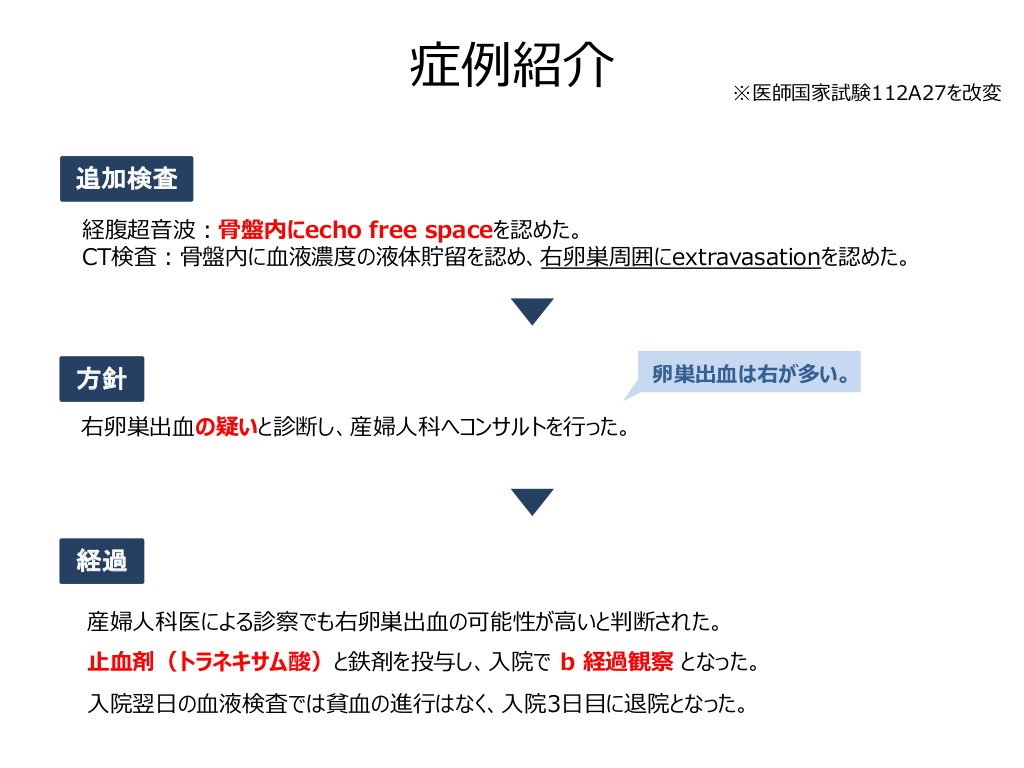 #12. 症例紹介 ※医師国家試験112A27を改変 追加検査 経腹超⾳波︓⾻盤内にecho free spaceを認めた。 CT検査︓⾻盤内に⾎液濃度の液体貯留を認め、右卵巣周囲にextravasationを認めた。 方針 卵巣出⾎は右が多い。 右卵巣出⾎の疑いと診断し、産婦⼈科へコンサルトを⾏った。 経過 産婦⼈科医による診察でも右卵巣出⾎の可能性が⾼いと判断された。 ⽌⾎剤(トラネキサム酸)と鉄剤を投与し、⼊院で b 経過観察 となった。 ⼊院翌⽇の⾎液検査では貧⾎の進⾏はなく、⼊院3⽇⽬に退院となった。