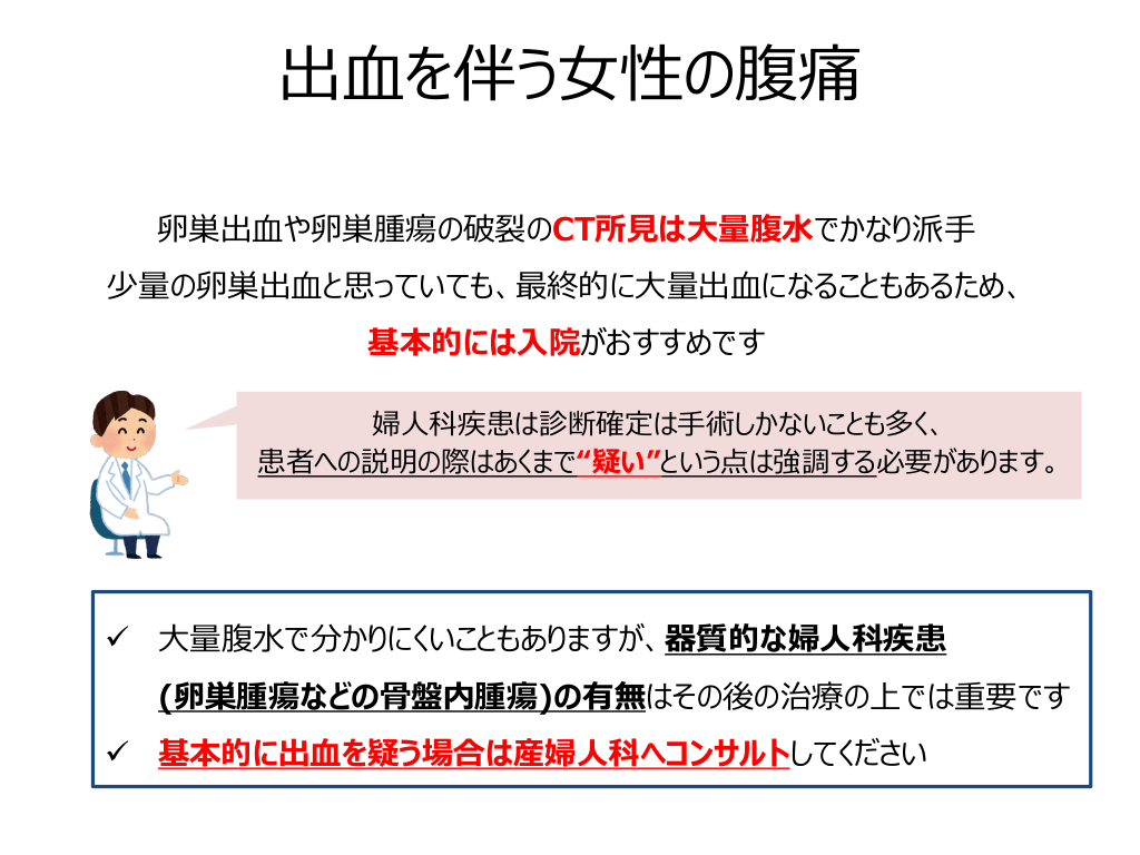 #13. 出⾎を伴う⼥性の腹痛 卵巣出⾎や卵巣腫瘍の破裂のCT所⾒は⼤量腹⽔でかなり派⼿ 少量の卵巣出⾎と思っていても、最終的に⼤量出⾎になることもあるため、 基本的には⼊院がおすすめです 婦⼈科疾患は診断確定は⼿術しかないことも多く、 患者への説明の際はあくまで“疑い”という点は強調する必要があります。 ü ⼤量腹⽔で分かりにくいこともありますが、器質的な婦⼈科疾患 (卵巣腫瘍などの⾻盤内腫瘍)の有無はその後の治療の上では重要です ü 基本的に出⾎を疑う場合は産婦⼈科へコンサルトしてください