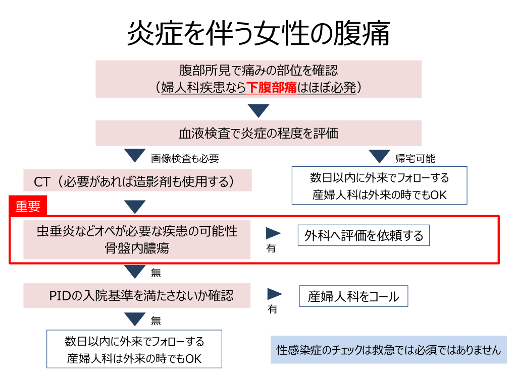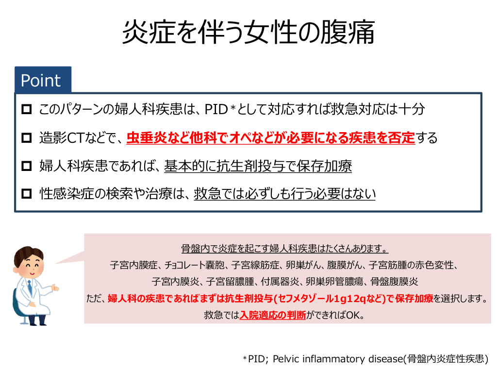 #14. 炎症を伴う⼥性の腹痛 Point p このパターンの婦⼈科疾患は、PID*として対応すれば救急対応は⼗分 p 造影CTなどで、⾍垂炎など他科でオペなどが必要になる疾患を否定する p 婦⼈科疾患であれば、基本的に抗⽣剤投与で保存加療 p 性感染症の検索や治療は、救急では必ずしも⾏う必要はない ⾻盤内で炎症を起こす婦⼈科疾患はたくさんあります。 ⼦宮内膜症、チョコレート嚢胞、⼦宮線筋症、卵巣がん、腹膜がん、⼦宮筋腫の⾚⾊変性、 ⼦宮内膜炎、⼦宮留膿腫、付属器炎、卵巣卵管膿瘍、⾻盤腹膜炎 ただ、婦⼈科の疾患であればまずは抗⽣剤投与(セフメタゾール1g12qなど)で保存加療を選択します。 救急では⼊院適応の判断ができればOK。 * PID; Pelvic inflammatory disease(⾻盤内炎症性疾患)
