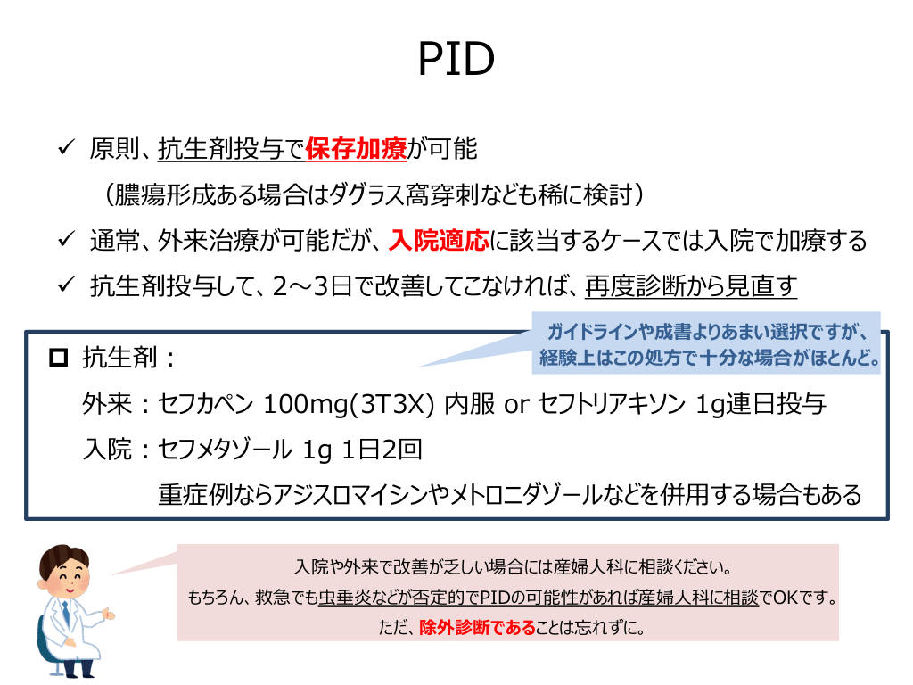 #16. PID ü 原則、抗⽣剤投与で保存加療が可能 (膿瘍形成ある場合はダグラス窩穿刺なども稀に検討) ü 通常、外来治療が可能だが、⼊院適応に該当するケースでは⼊院で加療する ü 抗⽣剤投与して、2〜3⽇で改善してこなければ、再度診断から⾒直す ガイドラインや成書よりあまい選択ですが、 経験上はこの処⽅で⼗分な場合がほとんど。 p 抗⽣剤︓ 外来︓セフカペン 100mg(3T3X) 内服 or セフトリアキソン 1g連⽇投与 ⼊院︓セフメタゾール 1g 1⽇2回 重症例ならアジスロマイシンやメトロニダゾールなどを併⽤する場合もある ⼊院や外来で改善が乏しい場合には産婦⼈科に相談ください。 もちろん、救急でも⾍垂炎などが否定的でPIDの可能性があれば産婦⼈科に相談でOKです。 ただ、除外診断であることは忘れずに。