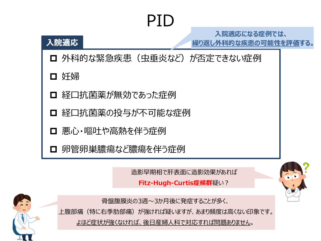 #17. PID 入院適応 ⼊院適応になる症例では、 繰り返し外科的な疾患の可能性を評価する。 p 外科的な緊急疾患(⾍垂炎など)が否定できない症例 p 妊婦 p 経⼝抗菌薬が無効であった症例 p 経⼝抗菌薬の投与が不可能な症例 p 悪⼼・嘔吐や⾼熱を伴う症例 p 卵管卵巣膿瘍など膿瘍を伴う症例 造影早期相で肝表⾯に造影効果があれば Fitz-Hugh-Curtis症候群疑い︖ ⾻盤腹膜炎の3週〜3か⽉後に発症することが多く、 上腹部痛(特に右季肋部痛)が強ければ疑いますが、あまり頻度は⾼くない印象です。 よほど症状が強くなければ、後⽇産婦⼈科で対応すれば問題ありません。