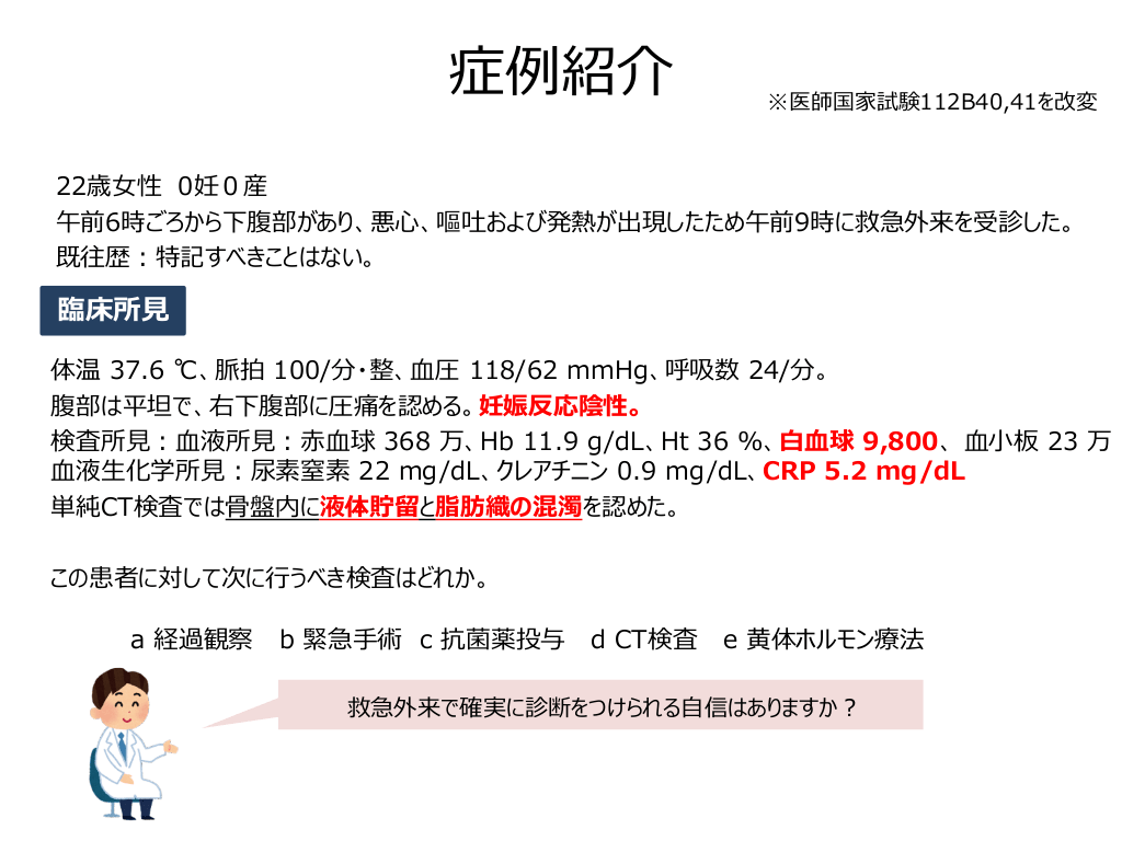 #18. 症例紹介 ※医師国家試験112B40,41を改変 22歳⼥性 0妊0産 午前6時ごろから下腹部があり、悪⼼、嘔吐および発熱が出現したため午前9時に救急外来を受診した。 既往歴︓特記すべきことはない。 臨床所⾒ 体温 37.6 ℃、脈拍 100/分・整、⾎圧 118/62 mmHg、呼吸数 24/分。 腹部は平坦で、右下腹部に圧痛を認める。妊娠反応陰性。 検査所⾒︓⾎液所⾒︓⾚⾎球 368 万、Hb 11.9 g/dL、Ht 36 %、⽩⾎球 9,800、 ⾎⼩板 23 万 ⾎液⽣化学所⾒︓尿素窒素 22 mg/dL、クレアチニン 0.9 mg/dL、CRP 5.2 mg/dL 単純CT検査では⾻盤内に液体貯留と脂肪織の混濁を認めた。 この患者に対して次に⾏うべき検査はどれか。 a 経過観察 b 緊急⼿術 c 抗菌薬投与 d CT検査 e ⻩体ホルモン療法 救急外来で確実に診断をつけられる⾃信はありますか︖