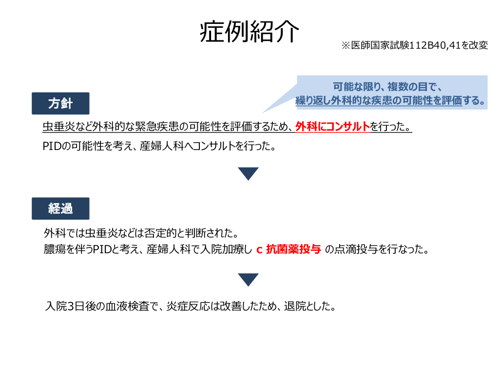 #19. 症例紹介 方針 ※医師国家試験112B40,41を改変 可能な限り、複数の⽬で、 繰り返し外科的な疾患の可能性を評価する。 ⾍垂炎など外科的な緊急疾患の可能性を評価するため、外科にコンサルトを⾏った。 PIDの可能性を考え、産婦⼈科へコンサルトを⾏った。 経過 外科では⾍垂炎などは否定的と判断された。 膿瘍を伴うPIDと考え、産婦⼈科で⼊院加療し c 抗菌薬投与 の点滴投与を⾏なった。 ⼊院3⽇後の⾎液検査で、炎症反応は改善したため、退院とした。