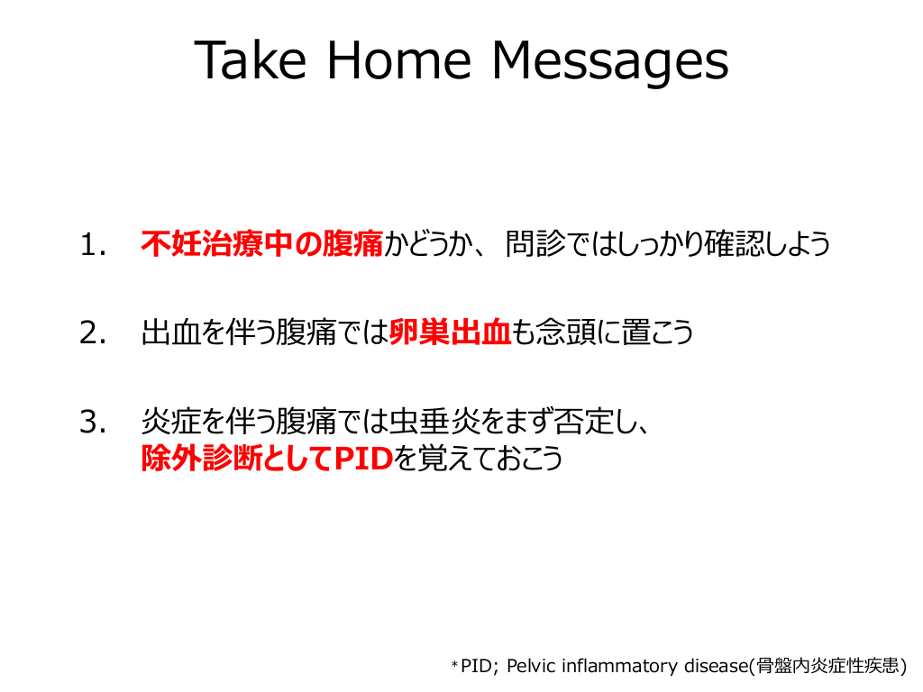 #2. Take Home Messages 1. 不妊治療中の腹痛かどうか、 問診ではしっかり確認しよう 2. 出⾎を伴う腹痛では卵巣出⾎も念頭に置こう 3. 炎症を伴う腹痛では⾍垂炎をまず否定し、 除外診断としてPIDを覚えておこう * PID; Pelvic inflammatory disease(⾻盤内炎症性疾患)