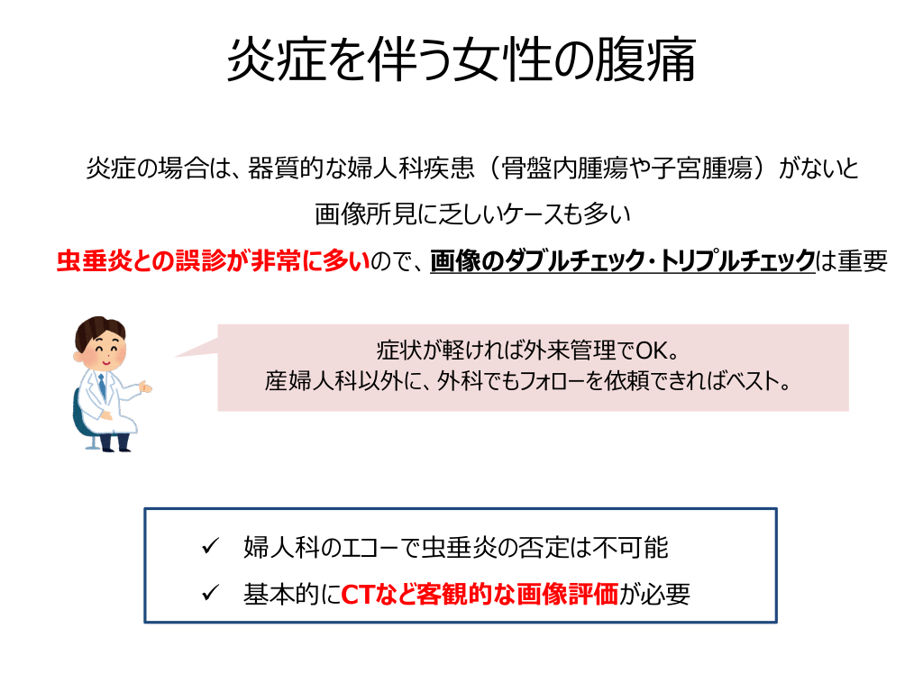 #20. 炎症を伴う⼥性の腹痛 炎症の場合は、器質的な婦⼈科疾患(⾻盤内腫瘍や⼦宮腫瘍)がないと 画像所⾒に乏しいケースも多い ⾍垂炎との誤診が⾮常に多いので、画像のダブルチェック・トリプルチェックは重要 症状が軽ければ外来管理でOK。 産婦⼈科以外に、外科でもフォローを依頼できればベスト。 ü 婦⼈科のエコーで⾍垂炎の否定は不可能 ü 基本的にCTなど客観的な画像評価が必要