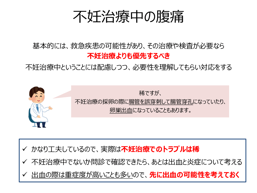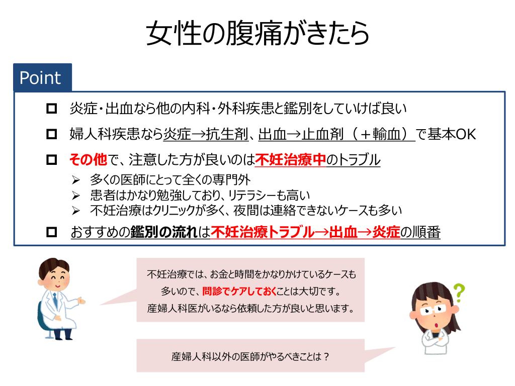 #4. ⼥性の腹痛がきたら Point p 炎症・出⾎なら他の内科・外科疾患と鑑別をしていけば良い p 婦⼈科疾患なら炎症→抗⽣剤、出⾎→⽌⾎剤(+輸⾎)で基本OK p その他で、注意した⽅が良いのは不妊治療中のトラブル Ø 多くの医師にとって全くの専⾨外 Ø 患者はかなり勉強しており、リテラシーも⾼い Ø 不妊治療はクリニックが多く、夜間は連絡できないケースも多い p おすすめの鑑別の流れは不妊治療トラブル→出⾎→炎症の順番 不妊治療では、お⾦と時間をかなりかけているケースも 多いので、問診でケアしておくことは⼤切です。 産婦⼈科医がいるなら依頼した⽅が良いと思います。 産婦⼈科以外の医師がやるべきことは︖