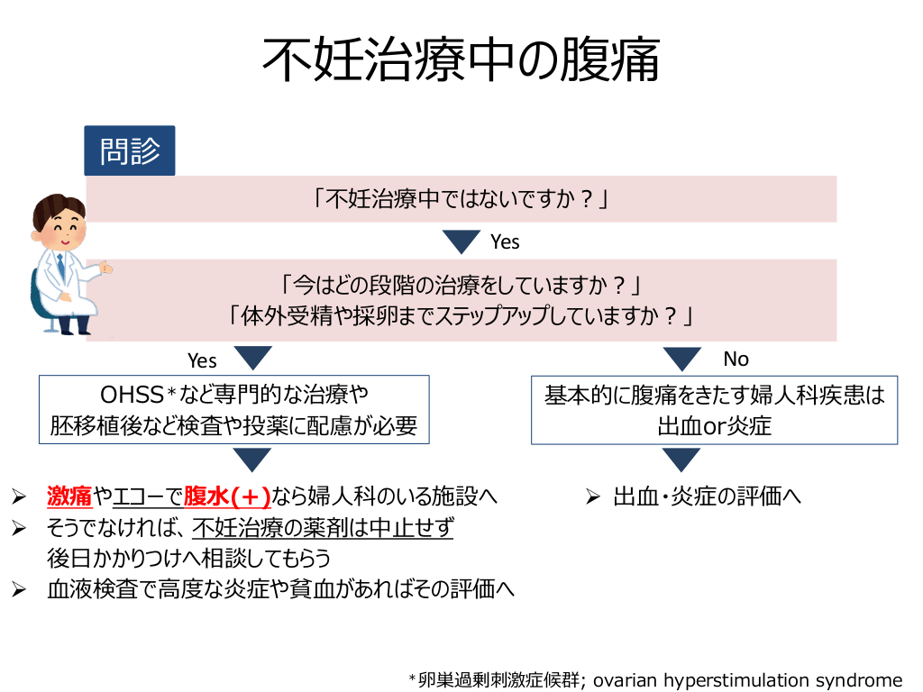 #5. 不妊治療中の腹痛 問診 「不妊治療中ではないですか︖」 Yes 「今はどの段階の治療をしていますか︖」 「体外受精や採卵までステップアップしていますか︖」 No Yes OHSS*など専⾨的な治療や 胚移植後など検査や投薬に配慮が必要 Ø 激痛やエコーで腹⽔(+)なら婦⼈科のいる施設へ Ø そうでなければ、不妊治療の薬剤は中⽌せず 後⽇かかりつけへ相談してもらう Ø ⾎液検査で⾼度な炎症や貧⾎があればその評価へ 基本的に腹痛をきたす婦⼈科疾患は 出⾎or炎症 Ø 出⾎・炎症の評価へ * 卵巣過剰刺激症候群; ovarian hyperstimulation syndrome