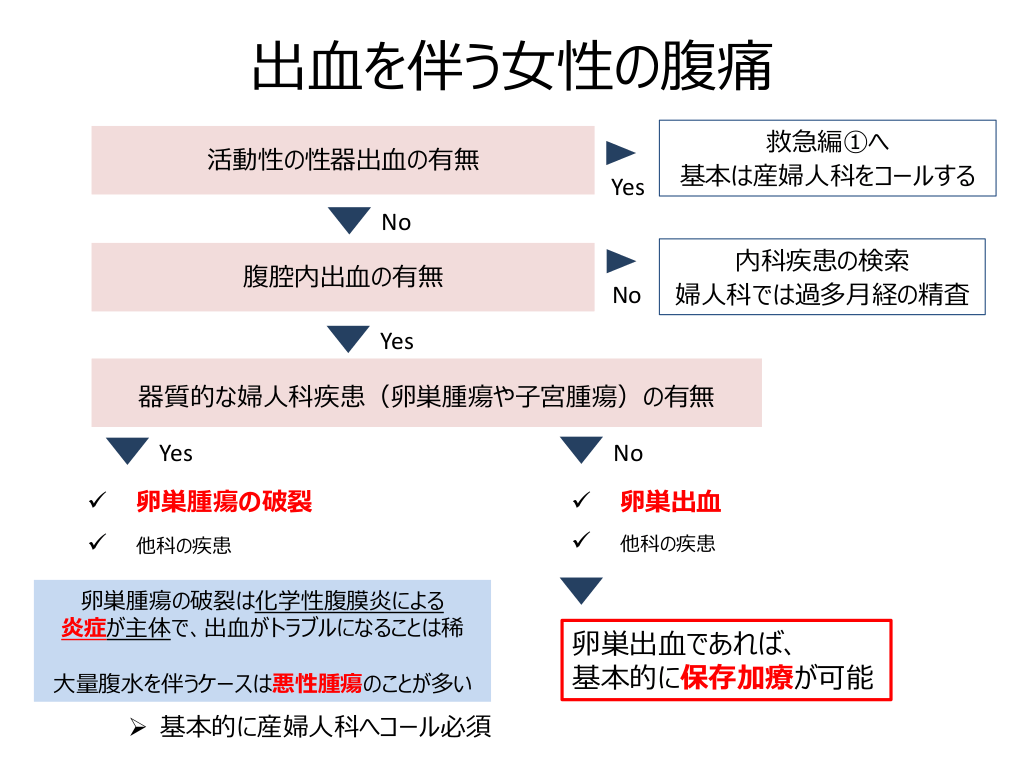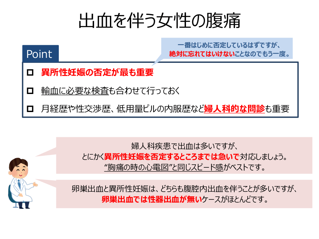 #7. 出⾎を伴う⼥性の腹痛 ⼀番はじめに否定しているはずですが、 絶対に忘れてはいけないことなのでもう⼀度。 Point p 異所性妊娠の否定が最も重要 p 輸⾎に必要な検査も合わせて⾏っておく p ⽉経歴や性交渉歴、低⽤量ピルの内服歴など婦⼈科的な問診も重要 婦⼈科疾患で出⾎は多いですが、 とにかく異所性妊娠を否定するところまでは急いで対応しましょう。 “胸痛の時の⼼電図”と同じスピード感がベストです。 卵巣出⾎と異所性妊娠は、どちらも腹腔内出⾎を伴うことが多いですが、 卵巣出⾎では性器出⾎が無いケースがほとんどです。