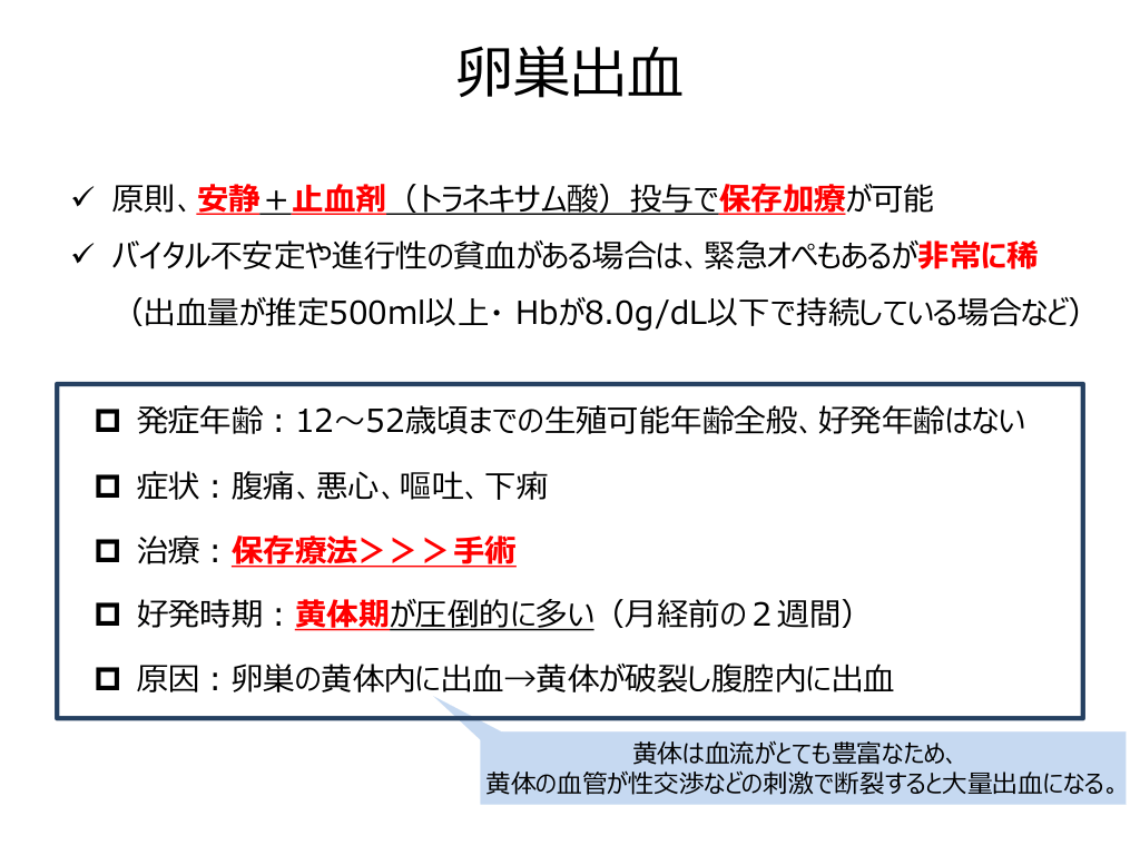 #9. 卵巣出⾎ ü 原則、安静+⽌⾎剤(トラネキサム酸)投与で保存加療が可能 ü バイタル不安定や進⾏性の貧⾎がある場合は、緊急オペもあるが⾮常に稀 (出⾎量が推定500ml以上・ Hbが8.0g/dL以下で持続している場合など) p 発症年齢︓12〜52歳頃までの⽣殖可能年齢全般、好発年齢はない p 症状︓腹痛、悪⼼、嘔吐、下痢 p 治療︓保存療法>>>⼿術 p 好発時期︓⻩体期が圧倒的に多い(⽉経前の2週間) p 原因︓卵巣の⻩体内に出⾎→⻩体が破裂し腹腔内に出⾎ ⻩体は⾎流がとても豊富なため、 ⻩体の⾎管が性交渉などの刺激で断裂すると⼤量出⾎になる。