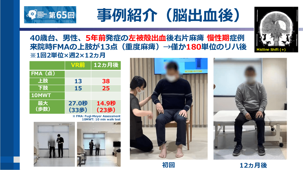 #10. 事例紹介(脳出血後) 40歳台、男性、5年前発症の左被殻出血後右片麻痺 慢性期症例 来院時FMAの上肢が13点(重度麻痺)→僅か180単位のリハ後 ※1回2単位×週2×12ヵ月 FMA(点) 上肢 下肢 10MWT 最大 (歩数) VR前 12ヵ月後 13 15 38 25 Midline Shift (+) 27.0秒 14.9秒 (33歩) (23歩) ※ FMA: Fugl-Meyer Assessment 10MWT: 10 min walk test 初回 12ヵ月後