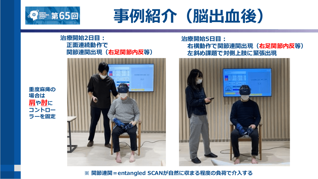 #11. 事例紹介(脳出血後) 治療開始2日目: 正面連続動作で 関節連関出現(右足関節内反等) 治療開始5日目: 右横動作で関節連関出現(右足関節内反等) 左斜め課題で対側上肢に緊張出現 重度麻痺の 場合は 肩や肘に コントロー ラーを固定 ※ 関節連関=entangled SCANが自然に収まる程度の負荷で介入する