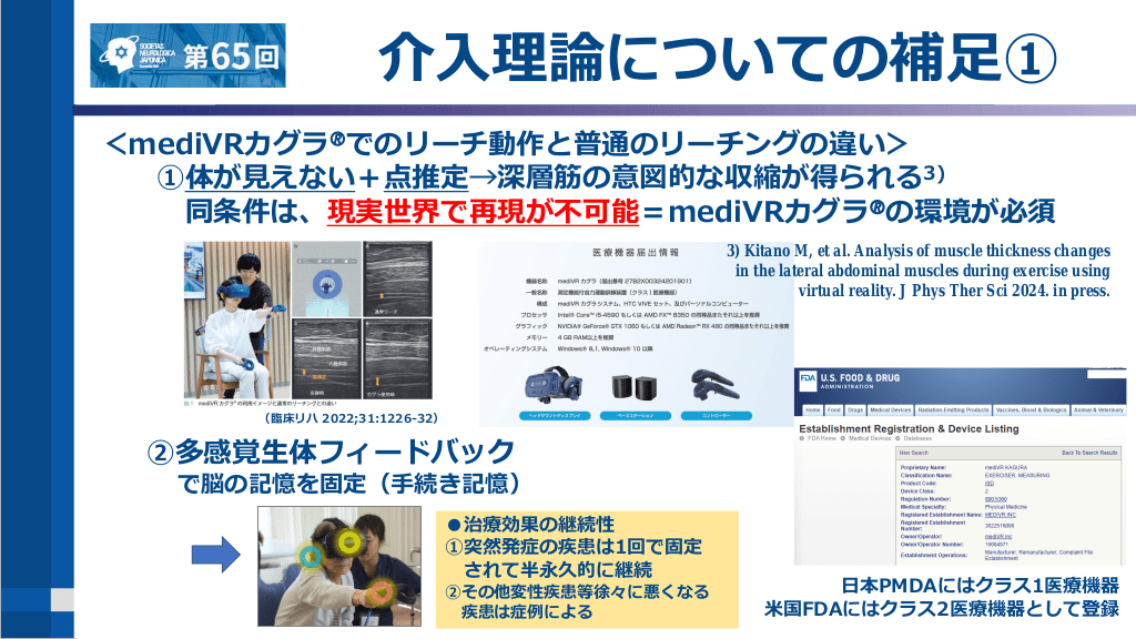 #12. 介入理論についての補足① <mediVRカグラ🄬でのリーチ動作と普通のリーチングの違い> ①体が見えない+点推定→深層筋の意図的な収縮が得られる3) 同条件は、現実世界で再現が不可能=mediVRカグラ🄬の環境が必須 3) Kitano M, et al. Analysis of muscle thickness changes in the lateral abdominal muscles during exercise using virtual reality. J Phys Ther Sci 2024. in press. (臨床リハ 2022;31:1226-32) ②多感覚生体フィードバック で脳の記憶を固定(手続き記憶) ●治療効果の継続性 ①突然発症の疾患は1回で固定 されて半永久的に継続 ②その他変性疾患等徐々に悪くなる 疾患は症例による 日本PMDAにはクラス1医療機器 米国FDAにはクラス2医療機器として登録