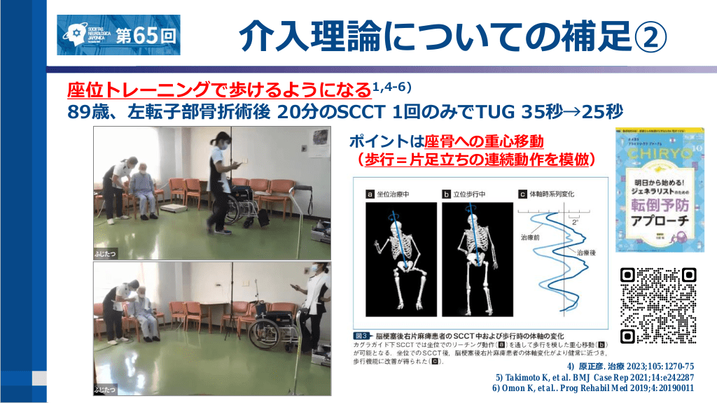 #13. 介入理論についての補足② 座位トレーニングで歩けるようになる1,4-6) 89歳、左転子部骨折術後 20分のSCCT 1回のみでTUG 35秒→25秒 ポイントは座骨への重心移動 (歩行=片足立ちの連続動作を模倣) 4) 原正彦. 治療 2023;105:1270-75 5) Takimoto K, et al. BMJ Case Rep 2021;14:e242287 6) Omon K, et al.. Prog Rehabil Med 2019;4:20190011