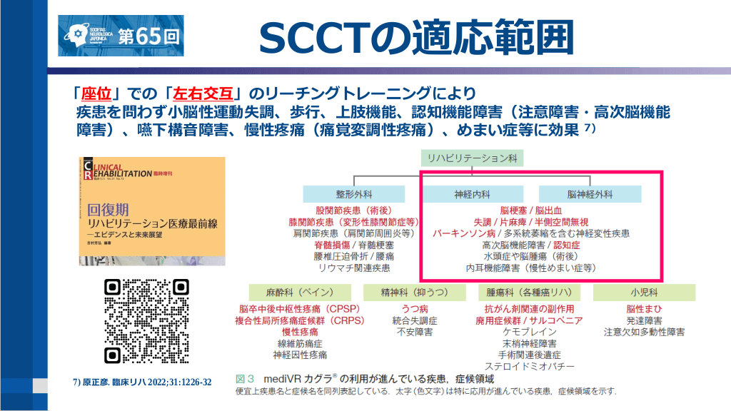 #14. SCCTの適応範囲 「座位」での「左右交互」のリーチングトレーニングにより 疾患を問わず小脳性運動失調、歩行、上肢機能、認知機能障害(注意障害・高次脳機能 障害)、嚥下構音障害、慢性疼痛(痛覚変調性疼痛)、めまい症等に効果 7) 7) 原正彦. 臨床リハ 2022;31:1226-32